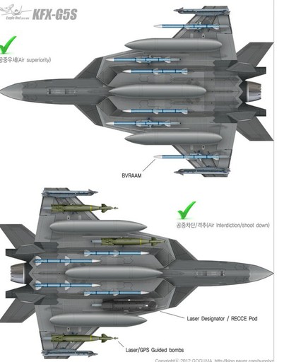 韓國公布的這組KFX-G5S戰(zhàn)機(jī)圖片中的另一關(guān)鍵技術(shù)要點(diǎn)是,有別于之前任何一款第五代戰(zhàn)機(jī)方案,韓國似乎在構(gòu)想KFX-G5S型戰(zhàn)機(jī)之初,就將外部掛載視作主要性能,而非像美制第五代戰(zhàn)機(jī)那樣,將外部掛載視作特殊情況下的無奈之舉。從韓國為KFX-G5S戰(zhàn)機(jī)規(guī)劃的掛載方案來看,作為輕型戰(zhàn)機(jī)的KFX-G5S,在無內(nèi)部掛載的情況下,外掛點(diǎn)超過10個(gè),基本達(dá)到F-16戰(zhàn)機(jī)的水平。如果再考慮第五代戰(zhàn)機(jī)較之第四代戰(zhàn)機(jī)較大的內(nèi)部空間帶來的機(jī)內(nèi)載油優(yōu)勢(shì),KFX-G5S型戰(zhàn)機(jī)的外掛能力應(yīng)在F-16之上。