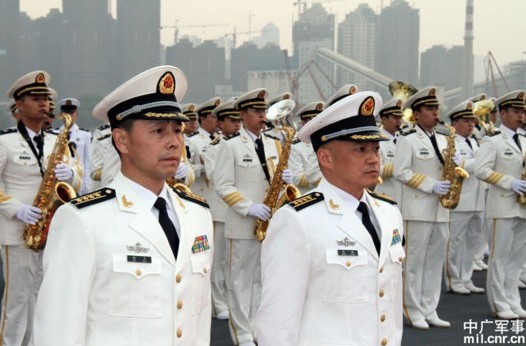 中國第一艘航空母艦遼寧艦艦長張崢(前右)政委梅文(前左)