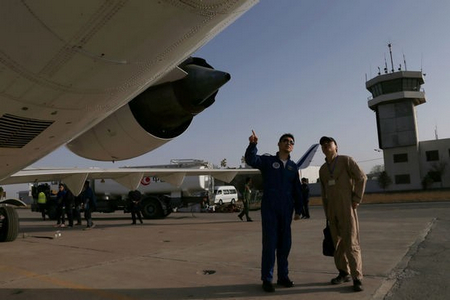 機務人員進行飛機狀態檢查。