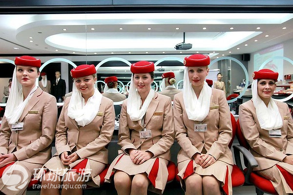 在迪拜的阿聯(lián)酋航空學院的教室里,空姐們身著制服,姿勢統(tǒng)一,形象俏麗宜人。