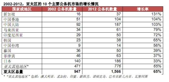 2002-2012,亞太區(qū)的10個(gè)主要公務(wù)機(jī)市場(chǎng)的增長(zhǎng)情況