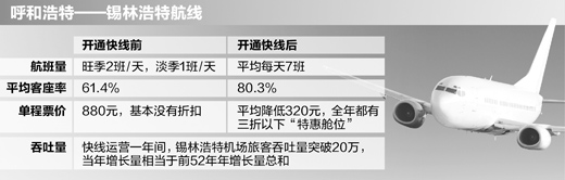 實施快線前,呼錫線上的機票基本沒有折扣,單程票價為880元。快線實施后,該航線每張票平均降低了320元,并且全年都有三折以下的“特惠艙位”。