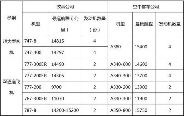 根據(jù)波音公司和空中客車公司公布的數(shù)據(jù),其主要寬體機(jī)型的航程數(shù)據(jù)如下: