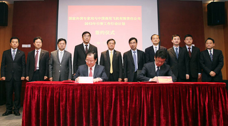 長期以來,國家外專局對中國商飛公司的人才引進工作高度重視。2009年,雙方簽訂了《引進國外智力服務(wù)框架協(xié)議》。2012年,雙方簽訂了《2012年引智工作行動計劃》,國家外專局還授予中國商飛公司全國首家“國家引進國外智力示范單位”稱號。