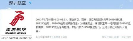 此外,“深圳航空”官方微博今天上午10:04發布信息稱:“2013年5月15日08:00-08:33,深航南京、西安、北京分別接到關于ZH9866航班、ZH9243航班、ZH9889航班的威脅信息。為確保安全,深圳航空第一時間安排ZH9866返航南京,ZH9243就近備降桂林,未起飛的ZH9889推遲起飛,三地公安已分別介入調查。”