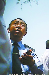 第一個趕到現場搶救傷者的他正在向領導匯報當時的情況。記者 陶剛 攝