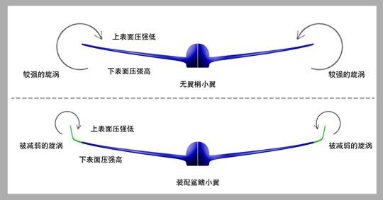 飛機飛行時,機翼下表面壓強高,上表面壓強低,因此下表面氣流就會在翼尖處流向上表面,這樣在翼尖處就不斷形成旋渦,從而產生“誘導阻力”,阻礙飛機前行。鯊鰭小翼可以部分阻斷機翼翼尖處的上繞氣流,使旋渦減弱,從而減小阻力,進而達到節油的效果。