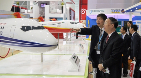 在中國商飛公司展區(qū),蘇波認真察看了C919大型客機混合級布局以及ARJ21-700飛機混合級、全經(jīng)濟級、行政機和公務機布局模型,聽取了公司兩大型號的最新研制進展、能力建設(shè)、人才隊伍建設(shè)、國際合作、民機產(chǎn)業(yè)體系建設(shè)等方面情況的匯報。蘇波表示,中國商飛公司成立5年來取得的成績令人鼓舞,工信部將一如既往地支持中國商飛公司的發(fā)展建設(shè),希望中國商飛公司再接再厲、奮力拼搏,爭取早日取得大型客機項目的成功。