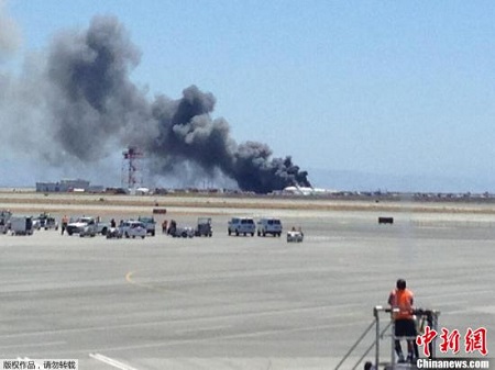一架韓亞航空公司的波音777型客機當地時間7月6日11點半在美國舊金山國際機場著陸時失事,機尾折斷,引發大火,并導致數十人傷亡。圖為失事現場濃煙滾滾。