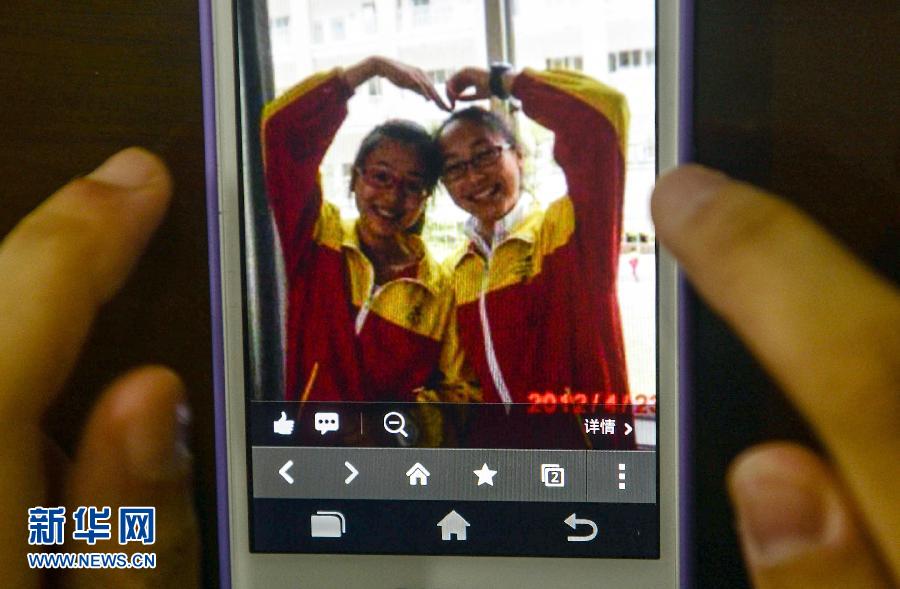 7月8日,江山中學(xué)高一(10)班一名學(xué)生在手機(jī)上展示QQ空間里王琳佳(右)和葉夢圓的合影。在韓亞航空舊金山墜機(jī)事故中不幸罹難的兩名中國乘客,是浙江省江山中學(xué)高一年級的學(xué)生王琳佳和葉夢圓。她們從初中起就是同學(xué),是很要好的朋友。兩人的離去,給師友留下無盡的思念。新華社記者韓傳號攝