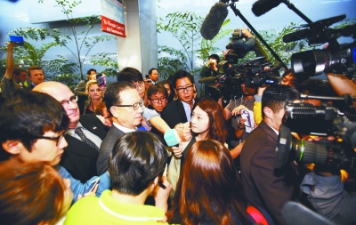 韓亞航空公司社長尹永斗(中左)抵達美國舊金山國際機場后接受媒體采訪。新華社/路透