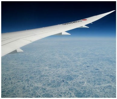 乘坐日航787-8夢幻客機從波士頓飛往東京的旅途中,俯瞰加拿大結冰水域。