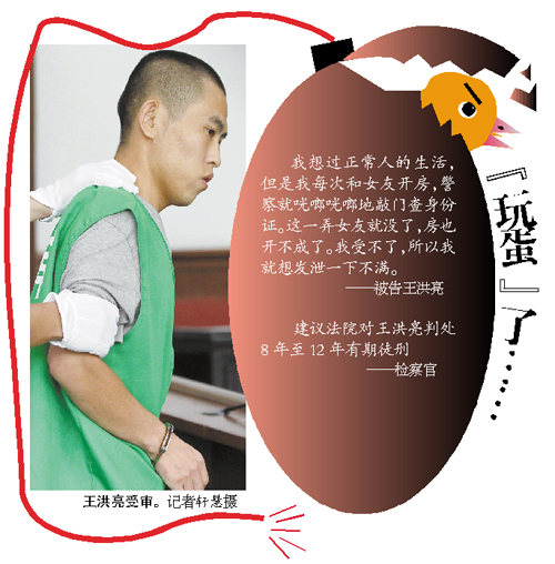 昨日,該案在深圳寶安法院開庭,被告王洪亮在法庭上認(rèn)罪,并自述犯罪動機(jī):“我想過正常人的生活,但是我每次和女友開房,警察就咣啷咣啷地敲門查身份證。這一弄女友就沒了,房也開不成了。我受不了,所以我就想發(fā)泄一下不滿。”