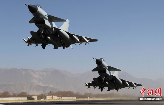 1月31日,雪域高原陽光明媚,萬里無云。駐藏空軍某軍用機場戰鷹列陣,車輛奔流,戰士們在緊張有序中拉開龍年新春首飛的序幕。圖為10時30分戰鷹準時編隊起飛。中新社發 劉應華 攝 圖片來源:CNSPHOTO
