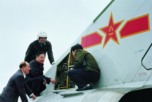 殲-8飛機0102號機試飛中,顧誦芬與飛行員和技術人員一起研究排除故障。