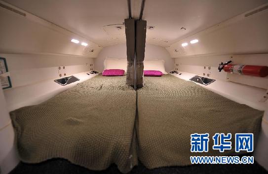 這是飛機內的機組人員休息室(12月9日攝)。 12月9日,波音787“夢想”飛機飛抵海口美蘭國際機場,開始為期2天的全球巡展海口站活動。此前波音公司于12月4日在北京啟動了787飛機全球巡展“夢想之旅”,之后將于11日飛赴非洲。波音787可搭載乘客210至250名,航程達14200至15200千米,飛行速度0.85馬赫。 新華社記者 郭程攝