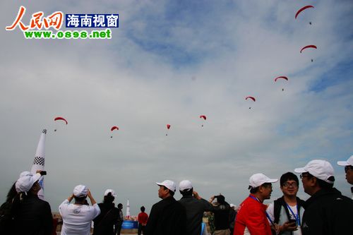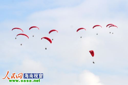21日上午8點(diǎn)左右,經(jīng)過一天的休整,2011環(huán)海南島飛行拉力賽東方段在東方市邊貿(mào)城正式開幕。比起前幾日的大風(fēng)天氣,今天的風(fēng)速明顯減弱,在?谖茨芘c廣大市民和游客見面的熱氣球、動(dòng)力傘、動(dòng)力三角翼今天也終于如愿升空,在東方的碧海藍(lán)天間盡情的翱翔。大批東方市民趕到現(xiàn)場(chǎng),一幕幕精彩的飛行表演引得現(xiàn)場(chǎng)尖叫連連、掌聲不斷。