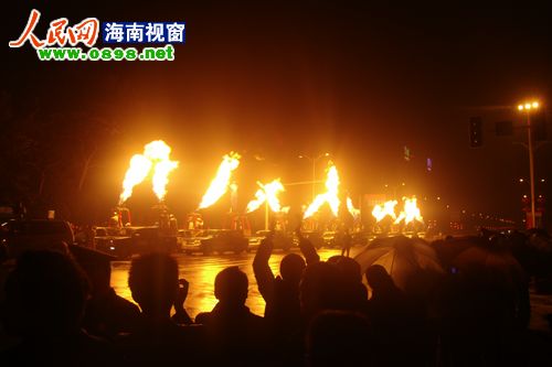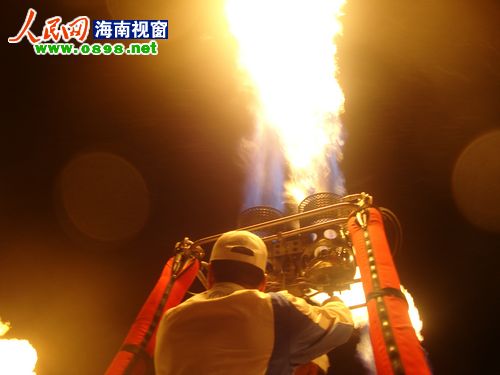 26日晚8點左右,2011環(huán)海南島飛行拉力賽萬寧段的首場活動——熱氣球噴火表演游行在萬寧市區(qū)上演。當晚,萬寧市區(qū)飄起了毛毛細雨,20個熱氣球組成的方陣從萬寧市人民中路與萬州大道交叉路口出發(fā),以人民公園為終點。在充滿動感的音樂聲中,熱氣球進行了多種樣式的噴火表演,交叉噴射,雙向噴射,搖擺噴射……整齊劃一的火柱照亮了萬寧的夜空,熾熱耀眼的火焰蒸發(fā)了綿綿的細雨。眾多萬寧市民早早守候在萬州大道兩旁,欣賞這難得一見的場景。方陣經(jīng)過的每個地方都引起尖叫聲一片,整條街道歡樂的氣氛達到了沸點。