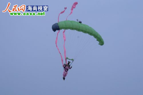 17日上午,2011環海南飛行拉力賽在海口舉行了隆重的開幕儀式。直升機同心圓旋轉、模型機超低空飛行、跳傘隊上演“七仙女下凡”……八一跳傘隊、河南跳傘隊、翱翔中國航空模型特技飛行表演隊等在萬綠園旁人工島上演了一場華麗的飛行表演秀,一系列超乎想象的精彩表演讓現場觀眾嘆為觀止。