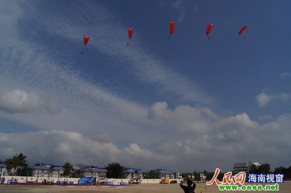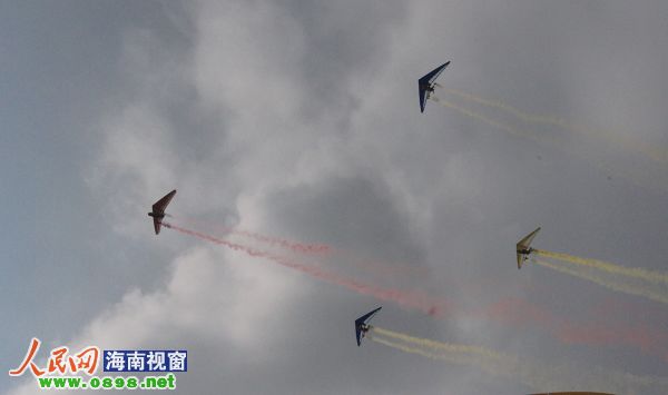 29日的萬寧晴空萬里,飛行特技運動員們早早便做好了準備,熱氣球、動力滑翔傘、三角翼、航空模型等飛行器材也準備完畢,早上10點,隨著歡樂的音樂響起,率先飛過場地的是捧著彩帶的三角翼編隊。