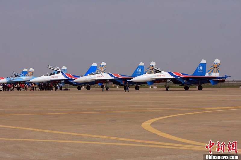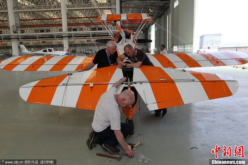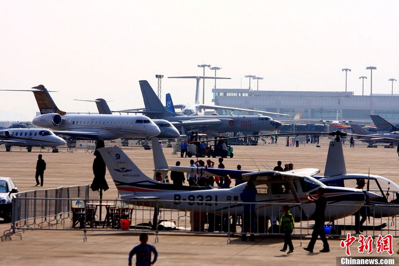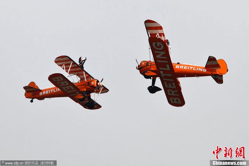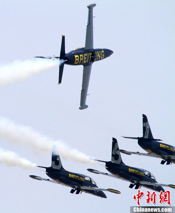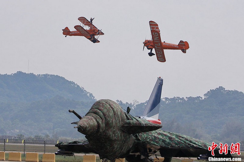 承辦中國航展的珠海航展有限公司副總經(jīng)理楊賢剛介紹,第九屆中國珠海航展有來自39個國家和地區(qū)近650家中外航空航天廠商參展,根據(jù)最新的參展飛機清單,本屆航展上的各類飛行器實物將為114架,包括殲擊機、直升機、客機、公務(wù)機、水陸兩棲多用途飛機等,有近50架將動態(tài)飛行展示;飛行表演將集中在 11月16日-18日。圖為一臺被包裹得嚴(yán)嚴(yán)實實的“棕子機”,其上方則是“百年靈”機翼行走飛行特技表演隊在進行訓(xùn)練。