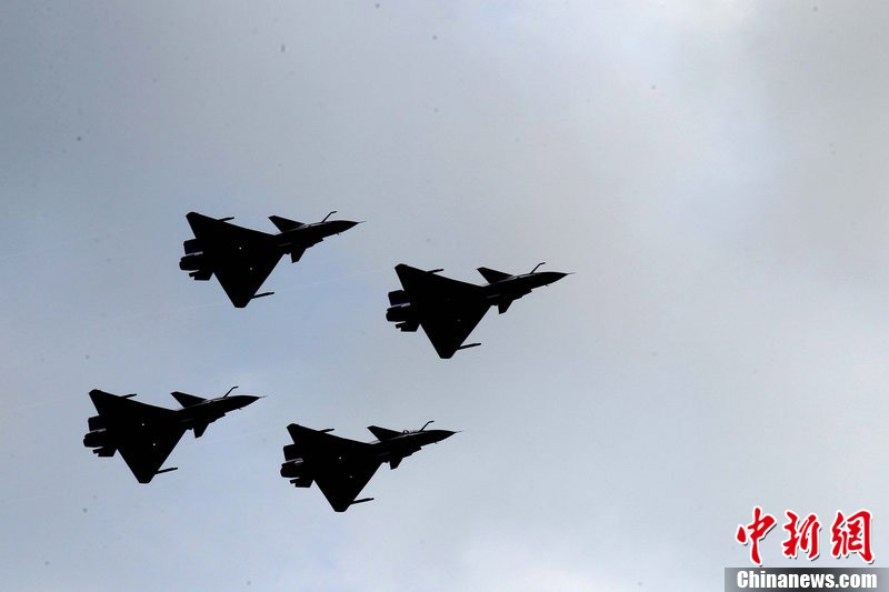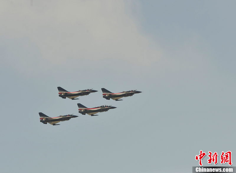 2012年11月10日,廣東省珠海市,八一飛行表演隊殲十戰機做編隊飛行練習。八一飛行表演隊將在珠海航展上做精彩編隊飛行表演。