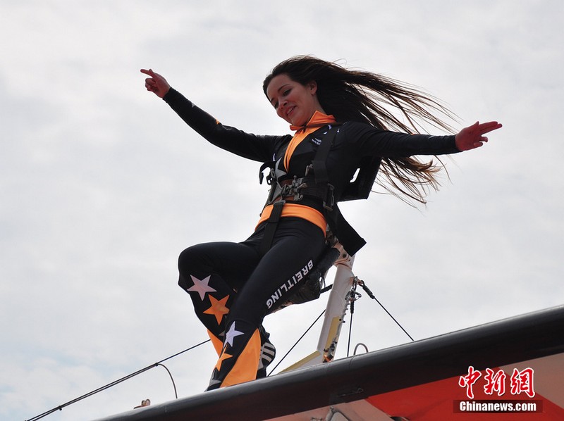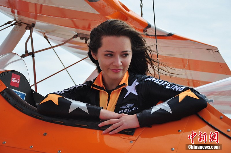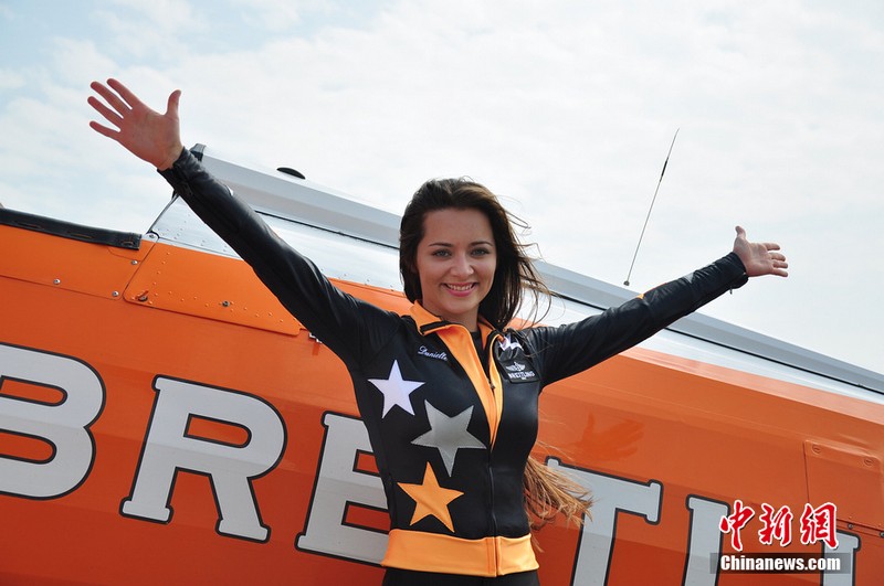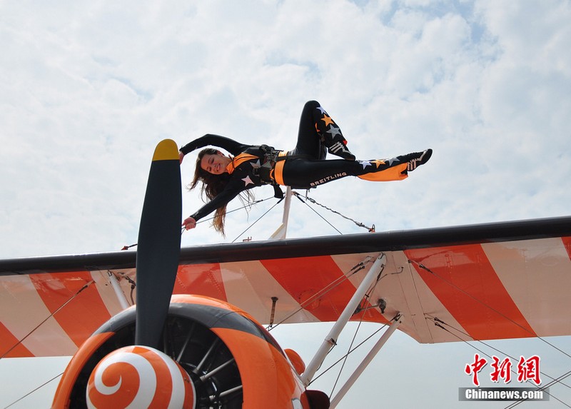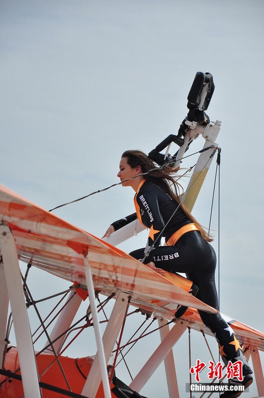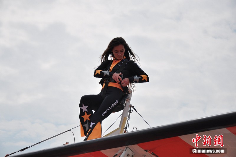 11月11日,歐洲“百年靈”機翼行走飛行表演隊的美女表演者在地面停放的飛機上進行了表演動作展示。