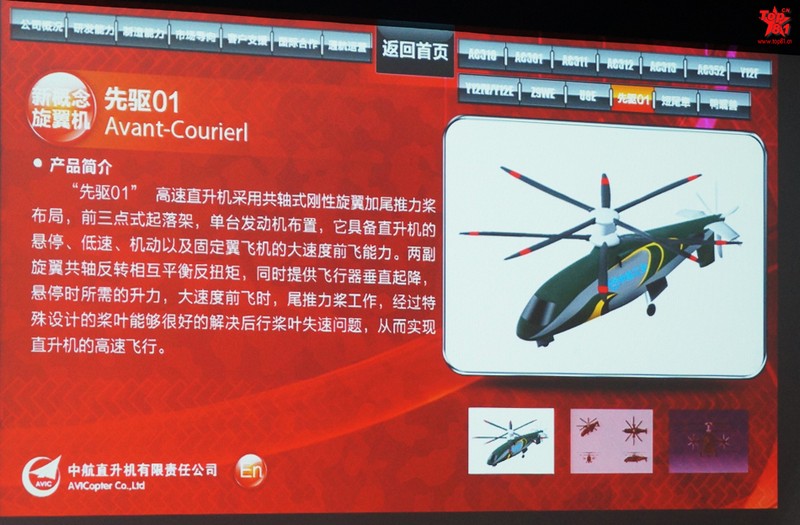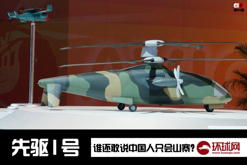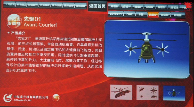 人民網北京11月9日電 (記者 楊鐵虎)中航工業直升機公司將在第九屆中國航展上展出“先驅01”新概念高速直升機模型。9日下午,中航工業直升機公司的專家向人民網記者介紹說,“先驅 01”新概念高速直升機采用共軸式剛性旋翼加尾推力槳布局,前三點式起落架,單臺發動機布置。具備直升機的懸停、低速、機動以及固定翼飛機的大速度前飛能力。