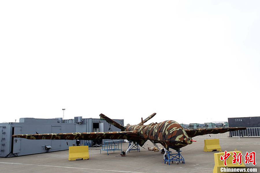 曾在前兩屆珠海航展上展出模型的翼龍無人機(jī),在今年航展上以實(shí)物參展。11月8日,該機(jī)已經(jīng)組裝完畢停放在展坪上。該款無人機(jī)由中航工業(yè)旗下成都飛機(jī)設(shè)計(jì)研究所研制,該機(jī)裝有一臺(tái)100馬力活塞發(fā)動(dòng)機(jī),具備全自主平輪式起降和飛行能力,最大起飛重量達(dá)1100公斤,最大續(xù)航時(shí)間為20個(gè)小時(shí),可攜帶各種偵察、激光照射/測距、電子對抗設(shè)備及小型空地打擊武器,可執(zhí)行監(jiān)視、偵查及對地攻擊任務(wù)等任務(wù),也可用于維穩(wěn)、反恐、邊界巡邏等。