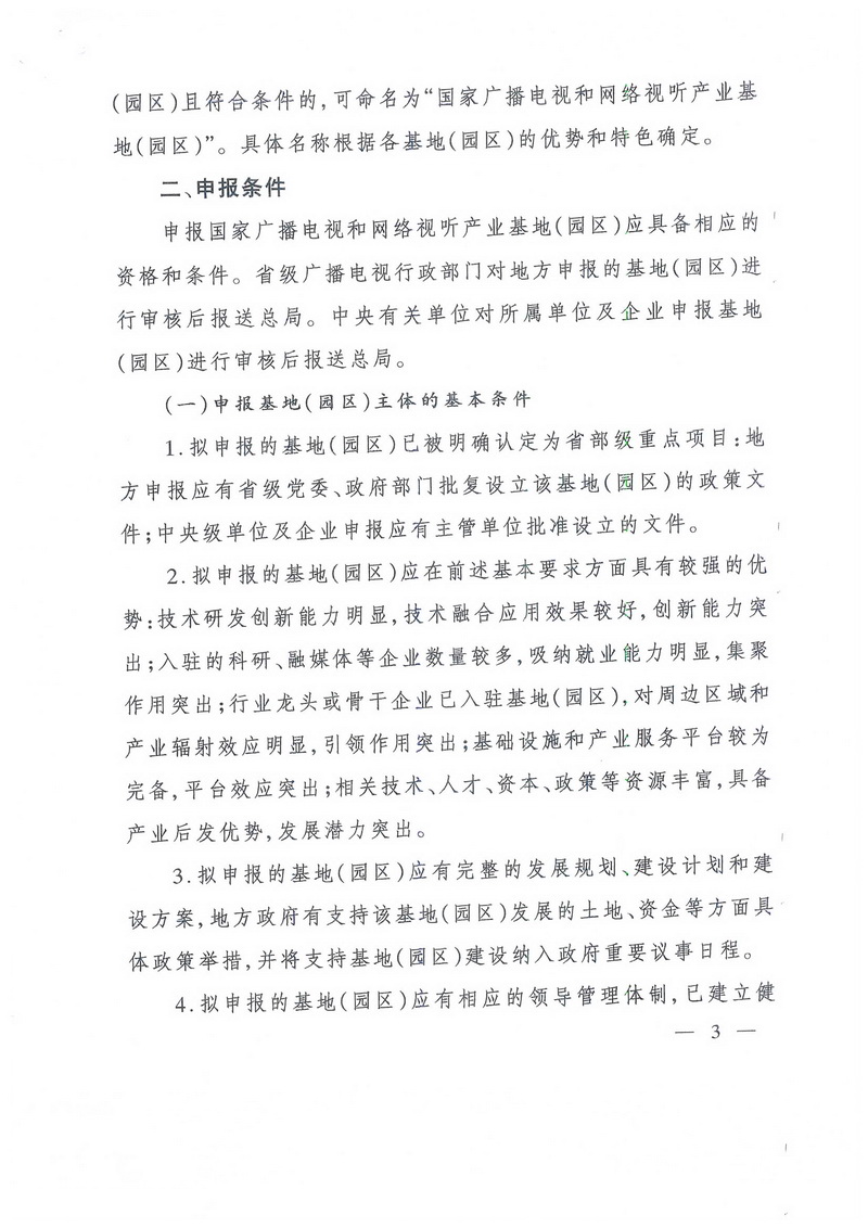 申報國家廣播電視和網絡視聽產業基地(園區)應具備相應的資格和條件。省級廣播電視行政部門對地方申報的基地(園區)進行審核后報送總局。中央有關單位對所屬單位及企業申報基地(園區)進行審核后報送總局。