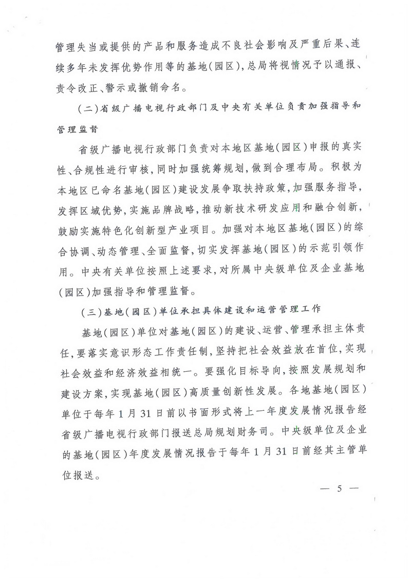 基地(園區)單位對基地(園區)的建設、運營、管理承擔主體責任,要落實意識形態工作責任制,堅持把社會效益放在首位,實現社會效益和經濟效益相統一。要強化目標導向,按照發展規劃和建設方案,實現基地(園區)高質量創新性發展。各地基地(園區)單位于每年1月31日前以書面形式將上一年度發展情況報告經省級廣播電視行政部門報送總局規劃財務司。中央級單位及企業的基地(園區)年度發展情況報告于每年1月31日前經其主管單位報送。