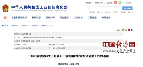 經濟日報-中國經濟網北京11月26日訊 日前,工業和信息化部發布《關于開展APP侵害用戶權益專項整治工作》的通知,《通知》稱,鑒于當前APP違規收集個人信息、過度索權、頻繁騷擾、侵害用戶權益等問題突出將開展專項整治工作,專項整治工作時間將一直持續至2019年12月20日。