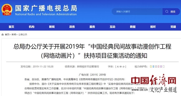 總局辦公廳關(guān)于開展2019年“中國經(jīng)典民間故事動漫創(chuàng)作工程(網(wǎng)絡(luò)動畫片)”扶持項目征集活動的通知