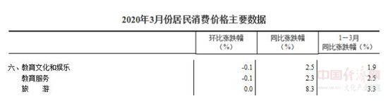 經濟日報-中國經濟網北京4月13日訊 日前,國家統計局發布了2020年3月份CPI和PPI數據。據悉,3月份,全國居民消費價格同比上漲4.3%,非食品價格上漲0.7%。全國居民消費價格環比下降1.2%,非食品價格下降0.4%。其中,在非食品中,教育文化和娛樂類同比上漲2.5%,環比下降0.1%。
