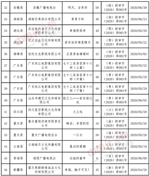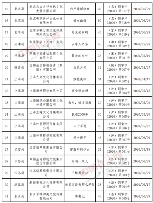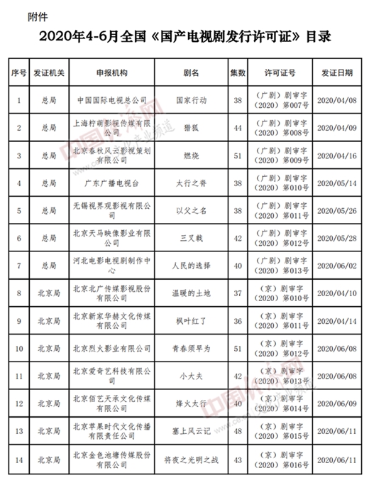 以下為2020年4至6月全國《國產電視劇發行許可證》目錄: