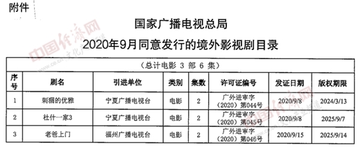 經(jīng)濟(jì)日報-中國經(jīng)濟(jì)網(wǎng)北京10月27日訊 26日,國家廣播電視總局辦公廳公布2020年9月全國引進(jìn)境外影視劇有關(guān)情況,由寧夏廣播電視臺引進(jìn)的《刺猬的優(yōu)雅》《杜什一家3》,福州廣播電視臺引進(jìn)的《老爸上門》等3部電影,入選《2020年9月同意發(fā)行的境外影視劇目錄》。