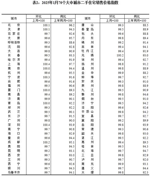 1月份,二線城市新建商品住宅銷售價格同比下降5.0%,降幅比上月收窄0.4個百分點;二手住宅同比下降7.6%,降幅比上月收窄0.3個百分點。三線城市新建商品住宅和二手住宅銷售價格同比分別下降6.0%和8.2%,降幅均比上月收窄0.2個百分點。