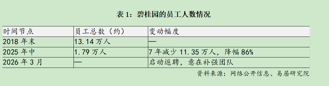 據嚴躍進分析,碧桂園此次啟動大規模返聘,是其經歷深度調整后,經營重心發生實質性轉變的明確信號。公開數據顯示,公司員工總數已從2018年末的約13萬人銳減至去年底的約2萬人,減員幅度超過80%。這一數據直觀地反映出,在過去幾年的行業深度調整期,企業為求生存不得不采取極致的縮表策略與降本增效措施。本質上,這背后折射出的,是房企出險后經營秩序被徹底打破的現實困境。