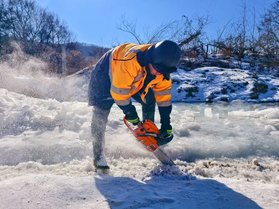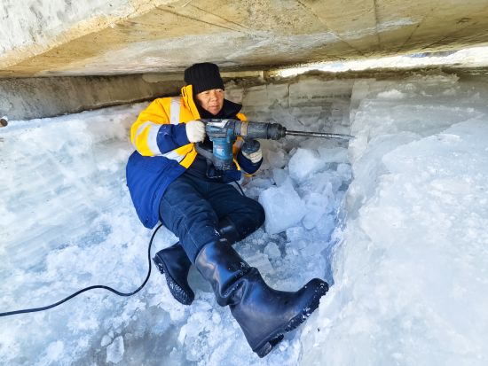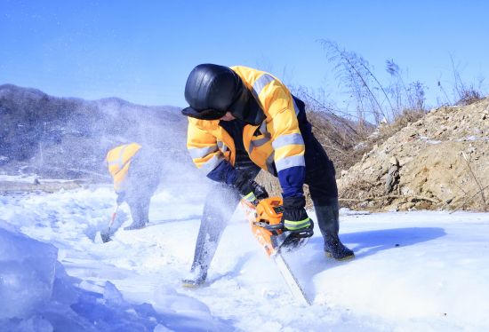 2月初的北方山區,寒風呼嘯,風力達五級,氣溫逼近零下20攝氏度。職工們手持油鋸、電鎬破開冰層,由于橋下空間有限,職工們有時需要半跪或是半躺式,一層層的進行破冰,然后再用鐵鍬將碎冰鏟至河道兩側。冰水混合物不斷濺到身上,迅速凝結成冰,不到半小時,許多人外套已覆上一層白霜,成了名副其實的“冰人”。然而無人停歇,破冰動作穩健而持續。
