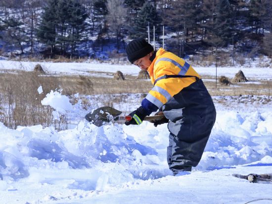“注意寬度和深度,把握好尺寸!”現場負責人羅軍一邊測量冰槽尺寸,一邊提醒作業人員。使用油鋸開鑿導流水道時,寬度必須精準:過窄則排水不暢,過寬則水流速緩,易重新凍結。每次作業,羅軍都會嚴格把關,確保導流槽既有效又持久。