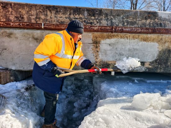 作業人員使用鐵鍬將冰塊從橋下鏟出。