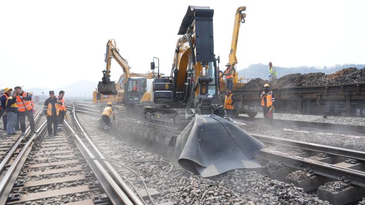 11時20分,隨著施工命令下達,道岔清篩機率先啟動,巨大的挖掘鏈精準探入道岔關鍵區域,在現場作業人員的配合下,將臟污的道砟挖出并輸送至線路一側,再由帶篩網的鉤機將清理出的泥土廢砟清運到軌道車的平板上。