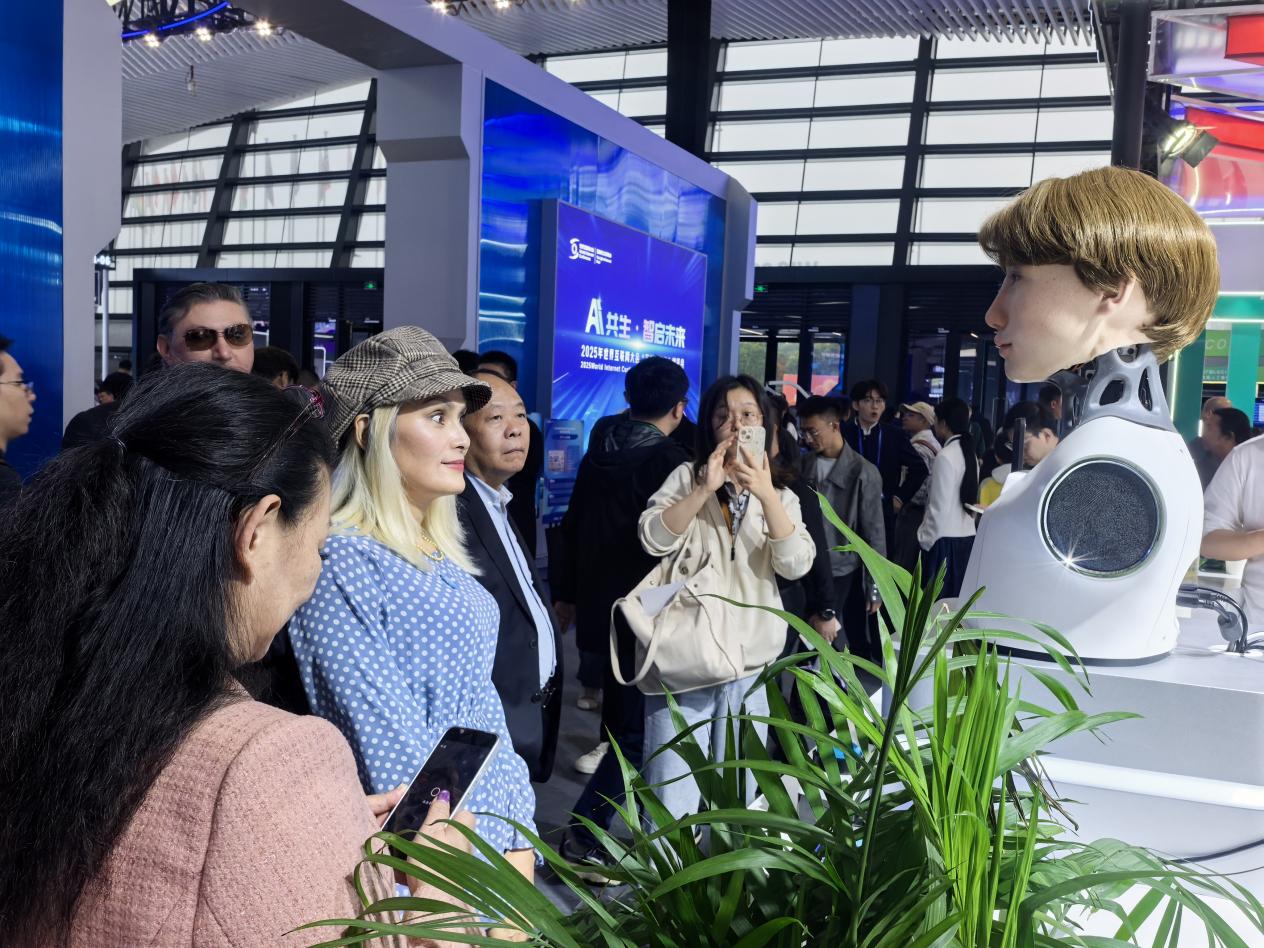 觀眾與松延動力仿生機器人互動,這款自主研發的仿生機器人可實時識別并模仿互動對象的各種面部表情。中國經濟網記者郭文培/攝
