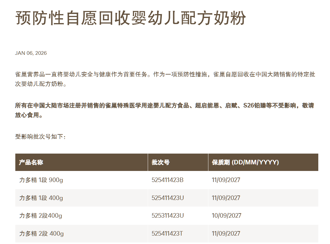 1月6日,雀巢大中華區(qū)官方網(wǎng)站發(fā)布兩則《預(yù)防性自愿回收嬰幼兒配方奶粉》公告。一份公告針對在中國大陸銷售的特定批次嬰幼兒配方奶粉,涉及力多精、鉑初能恩、舒宜能恩以及惠氏膳兒加兒童成長奶粉等30批次產(chǎn)品。另一份公告則針對所有此次涉事的進口自歐洲、在中國大陸跨境電商渠道銷售的嬰幼兒配方奶粉,涉及“Nestlé BEBA Supreme”“惠氏Wyeth啟賦未來”等41批次產(chǎn)品。