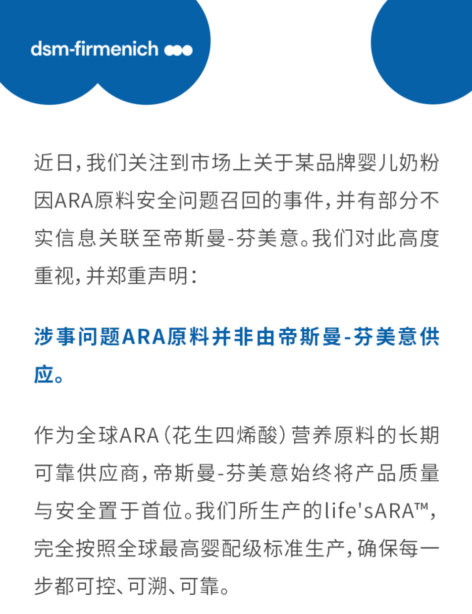 1月7日,帝斯曼通過官方公眾號發(fā)布聲明稱,涉事問題ARA原料并非由帝斯曼-芬美意供應(yīng)。該公司同時稱,因以上事件影響,其ARA原料需求激增,將全力協(xié)調(diào)產(chǎn)能,滿足市場需求。