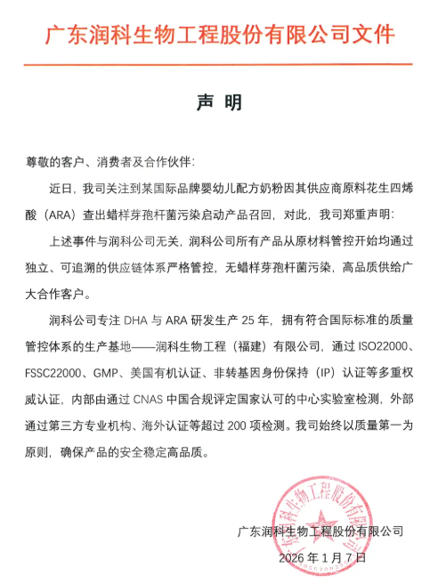 同日,廣東潤科生物工程股份有限公司也發(fā)布聲明稱,召回事件與潤科公司無關(guān),潤科公司所有產(chǎn)品從原材料管控開始均通過獨立、可追溯的供應(yīng)鏈體系嚴格管控,無蠟樣芽孢桿菌污染。