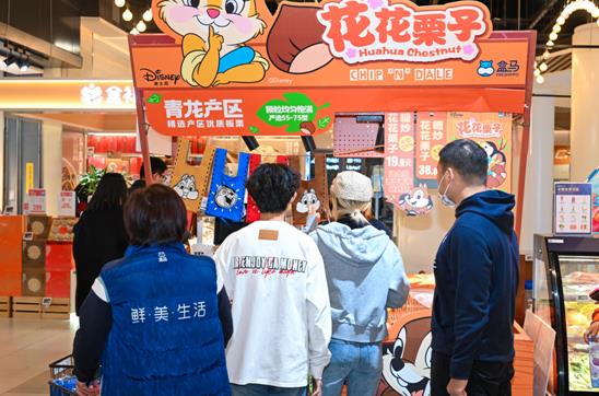 在哈一口氣便能凝結出霧的寒冬,暖呼呼的糖炒栗子最能溫暖人心。在午后的盒馬線下門店,糖炒栗子的檔口已經排起了長隊,工作人員將剛炒制出來的新鮮栗子裝進了印有迪士尼人物奇奇蒂蒂形象的紙盒里,遞給消費者。“甜甜糯糯的栗子,最適合當冬天小零食”、“沖著這個包裝來買的,太可愛了。”