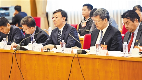 上圖 3月12日,人大內蒙古代表團舉行全體會議。全國人大代表、內蒙古自治區(qū)包頭市市長趙江濤(中)表示,生態(tài)文明建設利國利民。 本報記者 李景錄攝