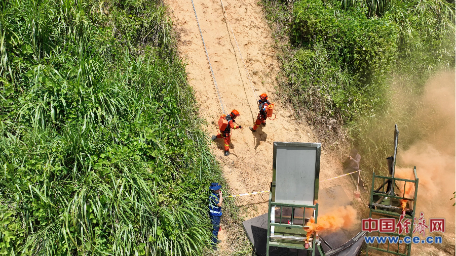 消防員在特殊地形處置煙點。特殊地形煙點處置是指在無法直接接近的陡坡設置模擬煙點(水袋),要求人員協同利用繩索技術安全抵近煙點進行處置,以輸水時間和組織的安全性綜合評定成績,檢驗特殊地形條件下滅火、救援技術結合運用的能力。 李為展/攝