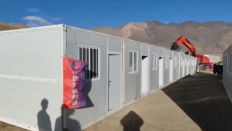 一排排活動板房已初步搭設完畢。與臨時搭建的帳篷相比,這些板房保暖效果更好。目前,板房內設備正在逐漸完善,將盡快安排受災群眾入住。 中國安能供圖